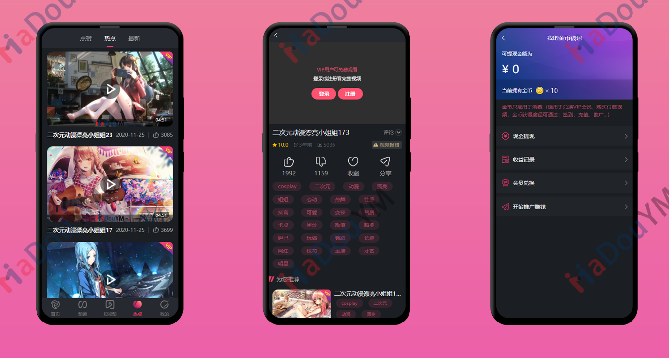 4.新增短视频模块,短视频每日试看次数功能,开启后游客和默认会员限制次数,VIP会员则不限制次数